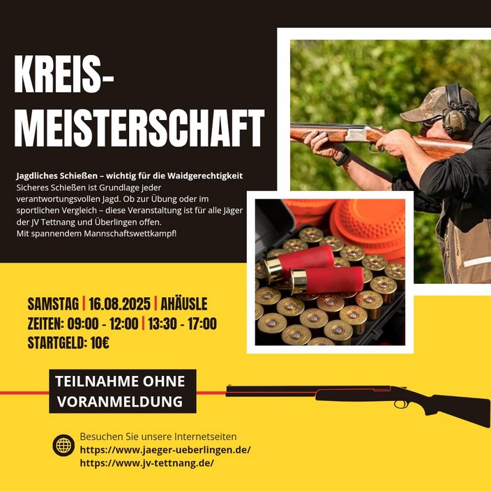 Sicheres Schießen ist Grundlage jeder verantwortungsvollen Jagd. Ob zur Übung oder im sportlichen Vergleich - diese Veranstaltung ist für alle Jäger der JV Tettnang und Überlingen offen. Mit spannendem Mannschaftswettkampf!