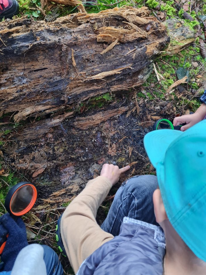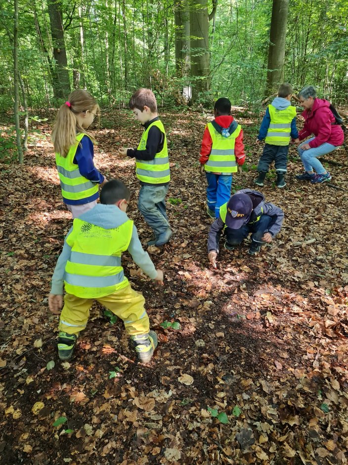 Eine Woche später, am Dienstag, den 13. Mai, ging es dann zum Kindergarten St. Columban in Friedrichshafen. Am Spielplatz Seewiese wartete bereits eine Gruppe von zukünftigen Schulkindern, mit denen wir gemeinsam in den Wald aufbrachen. Nach verschiedenen Teamaufgaben, die in Zusammenarbeit erledigt wurden, stand das Forschen und Entdecken im Mittelpunkt. Mit Lupen bewaffnet suchten die Kinder nach kleinen Waldbewohnern und waren begeistert, was sie alles fanden. Bei bestem Wetter hatten alle viel Freude und konnten die Natur auf spannende Weise erleben.